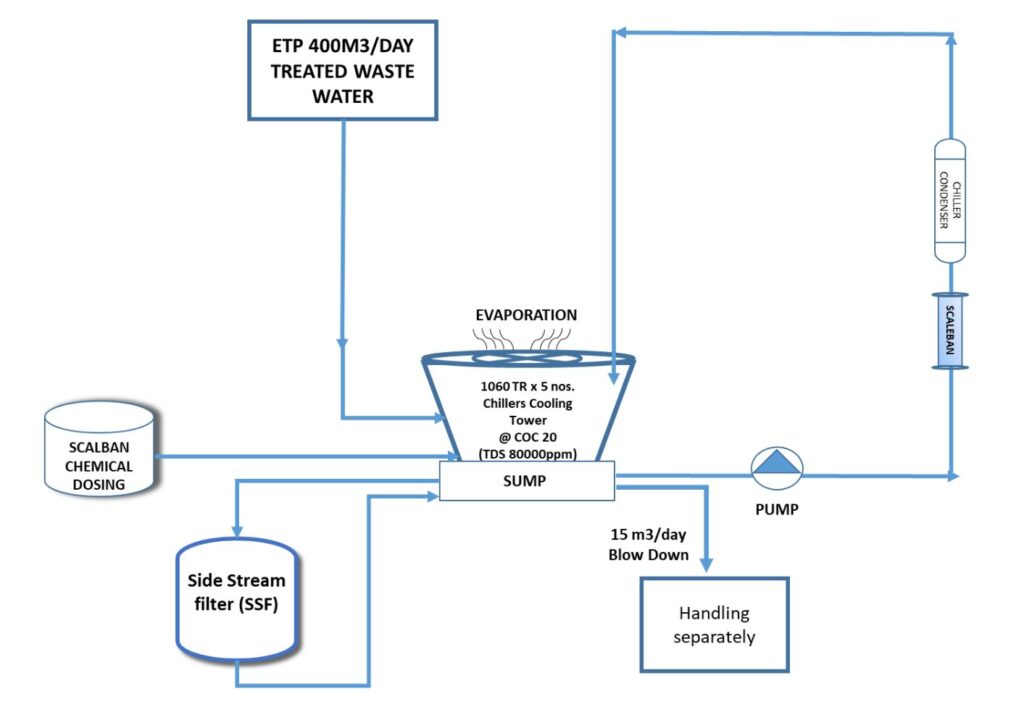 “ENVIROSUN” technology is handling total 600m3/day wastewater in all the Cooling Towers successfully and achieving their water conservation and ZLD objectives on a sustainable basis ,also saving equal amounts of fresh water. In the “ENVIROSUN” process we are operating a cooling tower at very high COC (20-25) with wastewater and maintaining 80,000 ppm ;of TDS in cooling tower recirculation water and giving only 15 m3/day concentrated blowdown, which Biocon is handling separately.