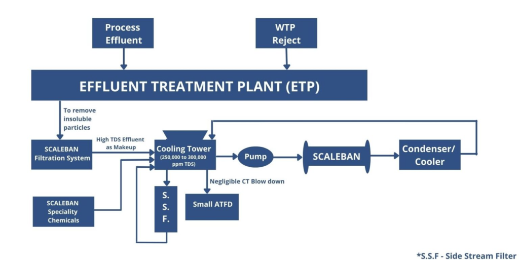 Scaleban technology offers an effective solution for achieving water conservation and Zero Liquid Discharge in industries by utilizing treated wastewater as makeup to cooling towers eliminating fresh water requirements while ensuring zero scales, corrosion, and biofouling. This technology also enables the high concentration of dissolved solids, with Total Dissolved Solids (TDS) ranging from 25% to 30%, in the cooling tower circuit. High TDS operation allows negligible blowdown from cooling towers, which can be directly used in ash quenching hence eliminating the requirement of wastewater RO and MEE.